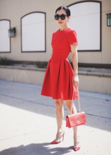 - Luxurious outfit, suitable not only for every day, but also for an evening out. Light blue blouse, combined with a scarlet skirt cut sun, knee-length. A great addition to this together will be lacquer boat beige shade.