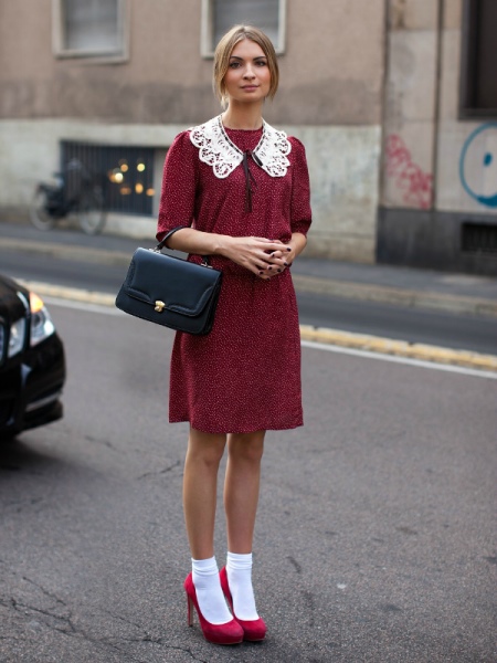- A beautiful delicate look in retro style: a straight, slightly loose dress of light satin crimson in small white polka dots, with a strap at the waist, perfectly complemented by a white lace collar and shoes in tone with the dress, worn over low white socks.