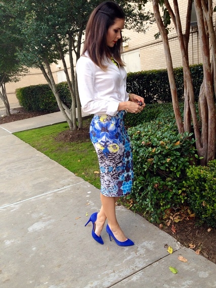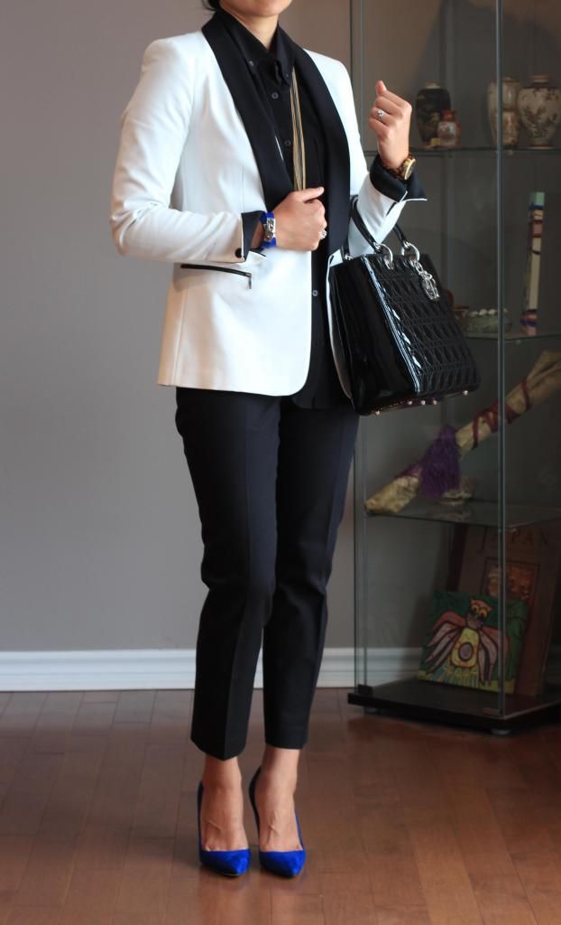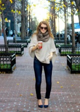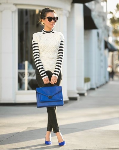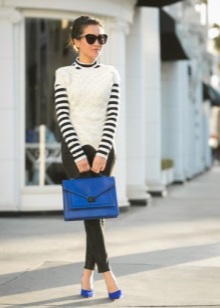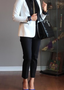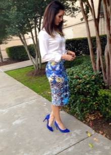 Blue shoes are well combined with business clothes of beige, gray or black and white color. The ensemble of a snow-white blouse, gray trouser suit and navy blue boats looks beautiful. Classic gray-blue shoes can be worn in tandem with a black pencil skirt and white blouse. On top you can wear a beautiful jacket, decorated with a black and white print.