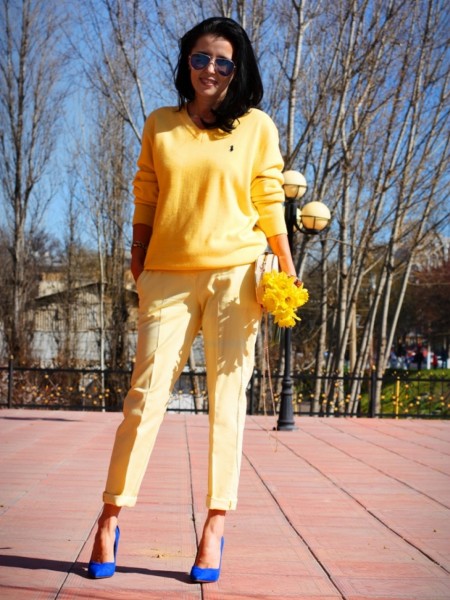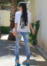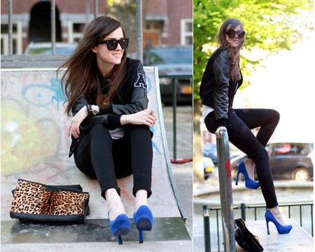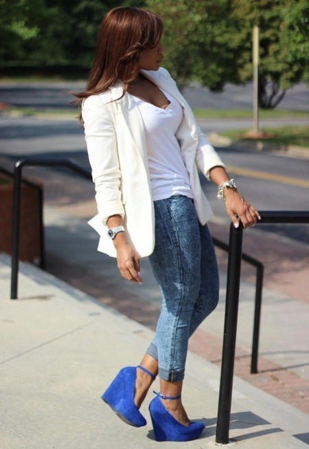 To create a fashionable bow in casual style, you can use different models of suede shoes, while there are no restrictions when choosing shades of blue. For example, suede shoes of bright blue color are very beautifully combined with clothes of green, white, pink or orange color.
