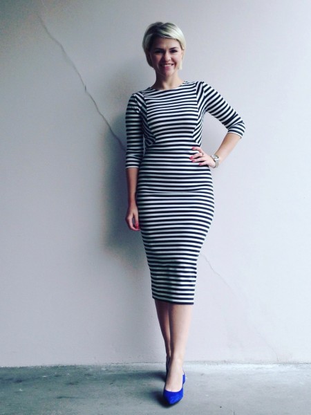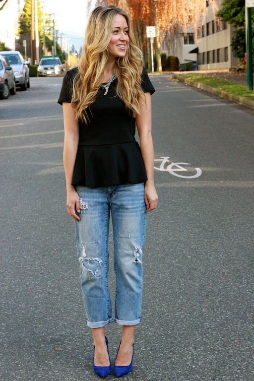 Blue wedge shoes blend in well with worn jeans and a black and white top to create a dramatic, summer look.
