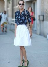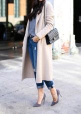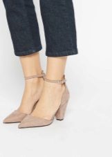- Suede beige or white shoes visually lengthen the leg and make the figure slimmer. Therefore, it is a win-win for girls with non-perfect figure. To create the effect of long legs, choose a model on an average heel of such a shade that will match the shade of your skin.