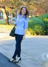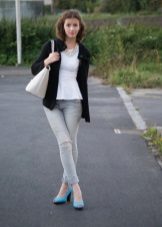 - Blue pumps will easily fit into your business wardrobe. They will complement the strict black and white look, which consists of a white blouse and a black pencil skirt. Completes the image of a fitted blue coat and gloves to match. It only remains to bring along a bright red or yellow handbag.