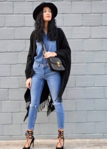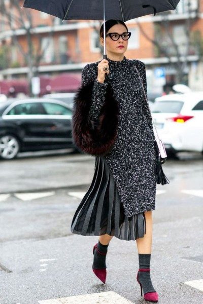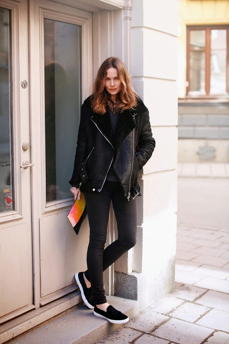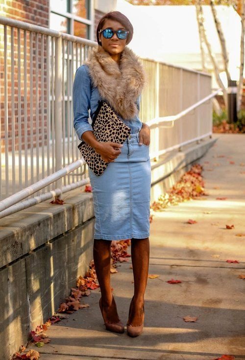 - Going to a party? Prefer suede mini-skirt shade tuap, black turtleneck, leather jacket with fringe and suede black shoes with a T-shaped strap. Thick black tights and a clutch with a dramatic print complete the look.