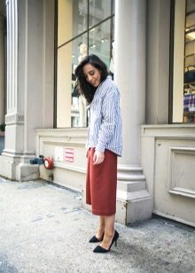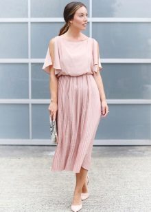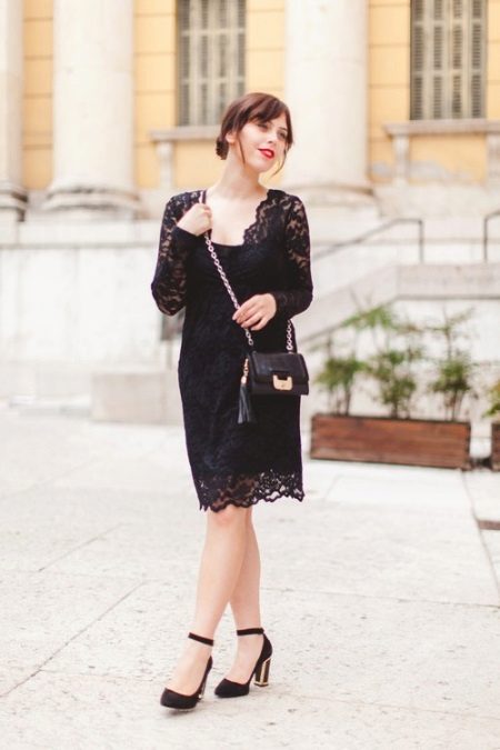 - For an evening out, you can choose an elegant lace dress midi length, adding a handbag on a long strap, suede shoes with a steady heel and red lipstick. You will look amazing!