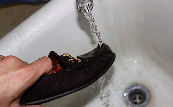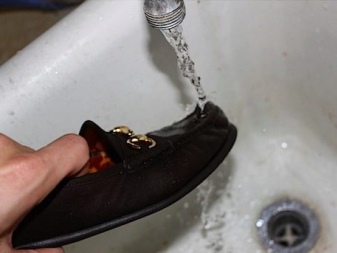 - True, if you splashed shoes with mud, you can not do without water. Substitute them under a warm stream of water, and then wipe dry with a clean cloth. Suede shoes can not be dried in the sun and even more so on the battery, they should dry in a natural way.