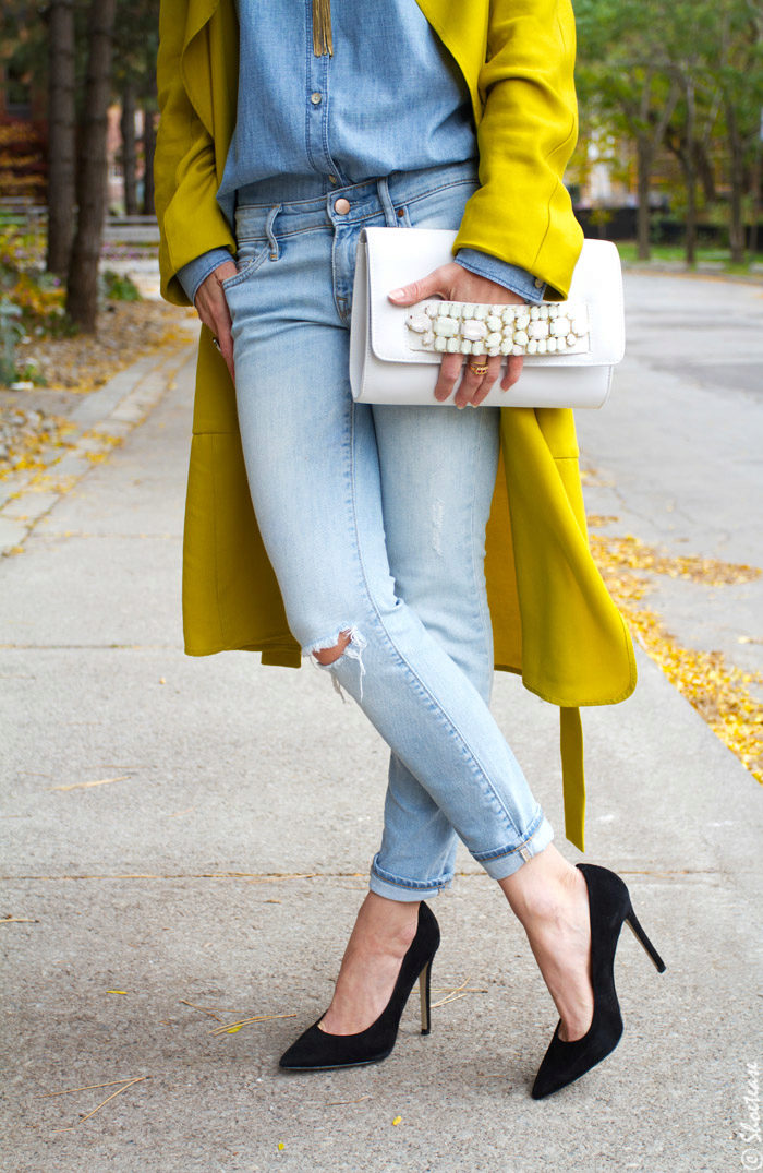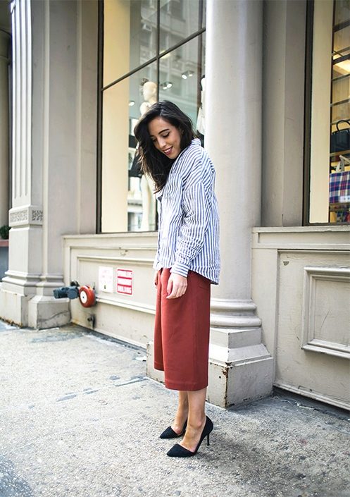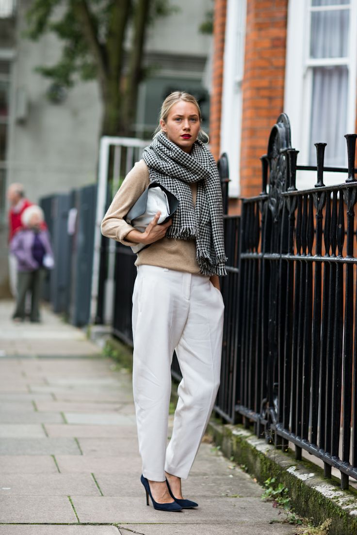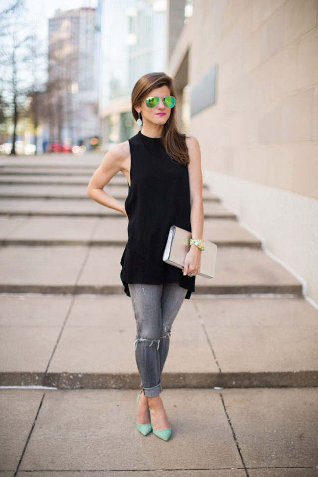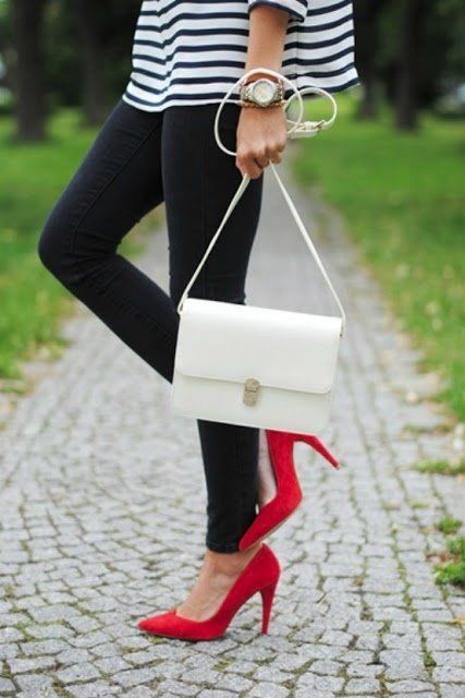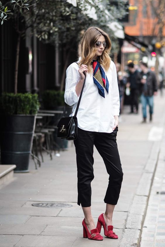 - Suede shoes with a thick, steady heel are perfect for every day. Wear them with black cropped trousers and a white shirt for release. A lookbag on a long strap and a bright silk scarf tied around the neck will complement the look.