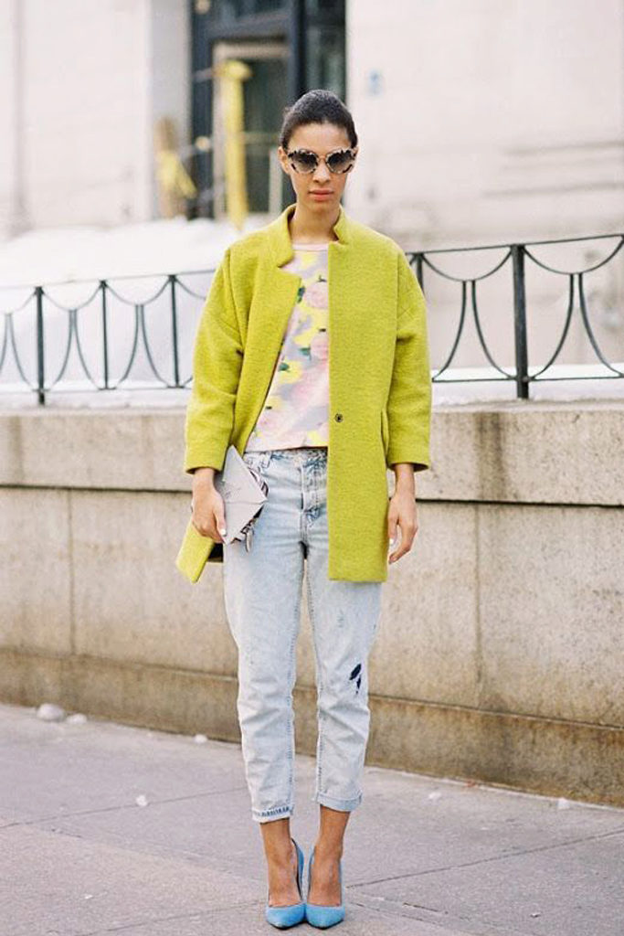 Multi-colored suede shoes will look good in bows in street style. They are suitable for jeans, skinny pants or short skirt. In the fall, these shoes will complement the image with a warm coat or a leather jacket.
