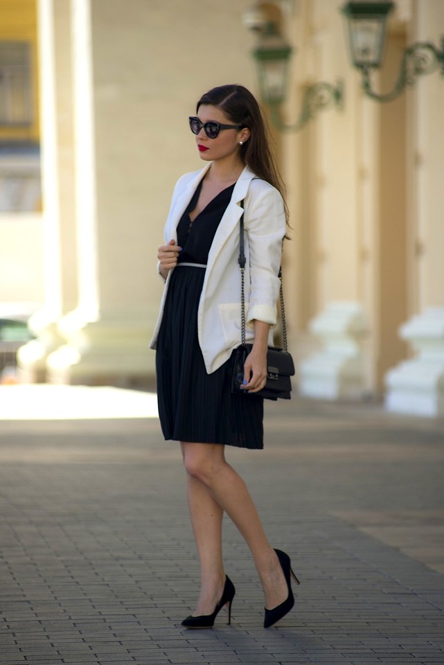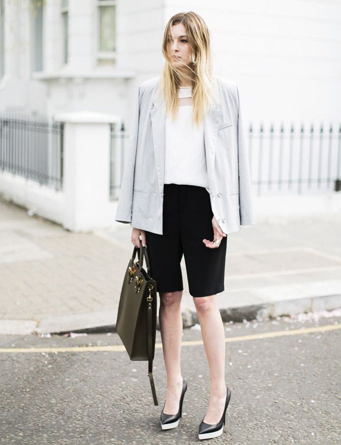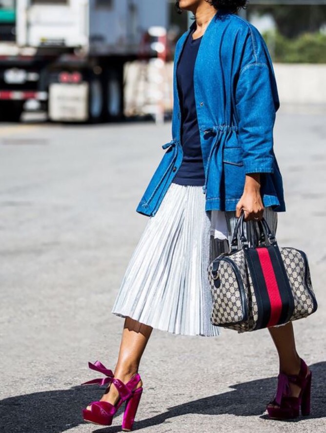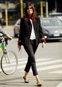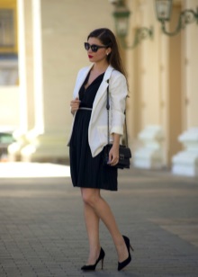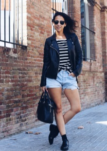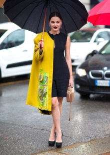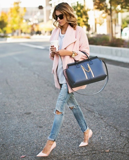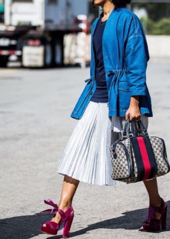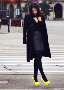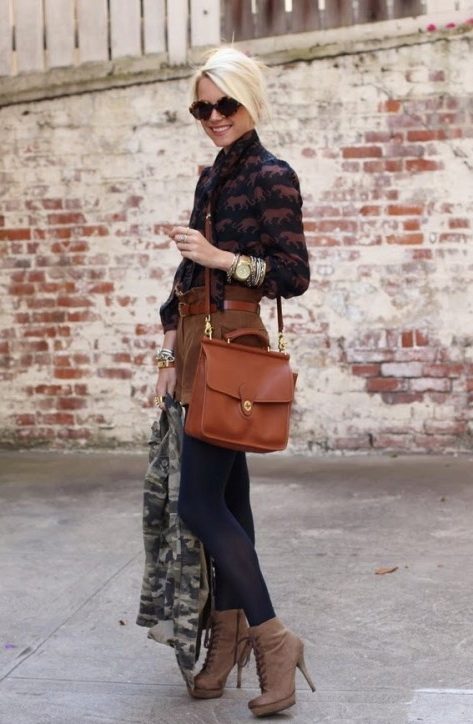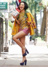 Very advanced, but at the same time a cute image will help to create closed-type autumn stilettos. The most interesting this model looks with shorts. If it seems to you that your image is not extravagant enough, you can add tights of an unusual shade, for example, blue ones. A jacket with a collar, decorated with ornaments, will help to justify the color range. Pay attention to accessories. A few bracelets on hand will complement the image well.