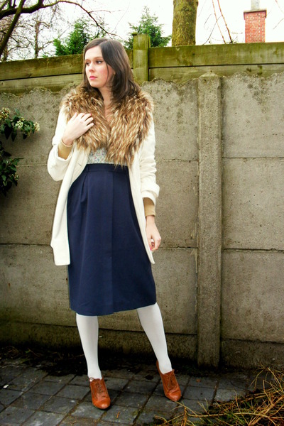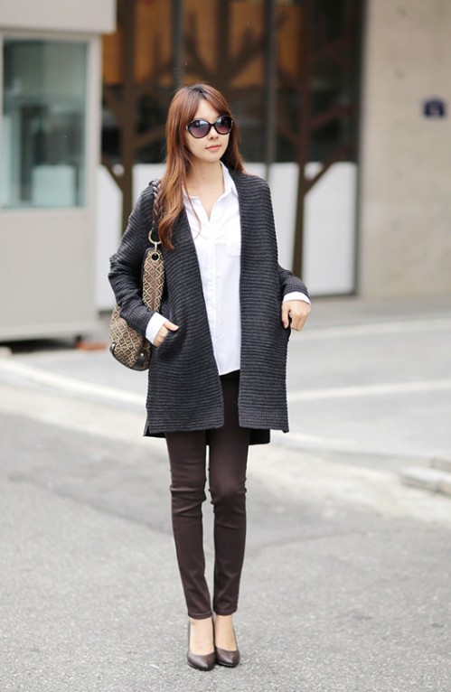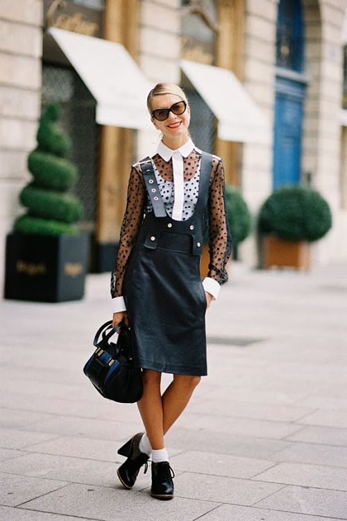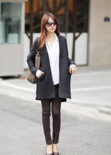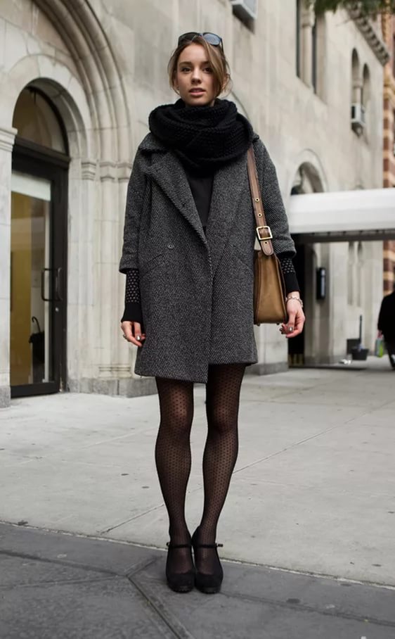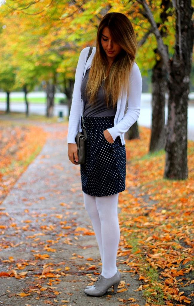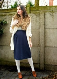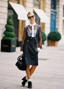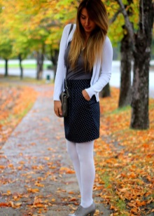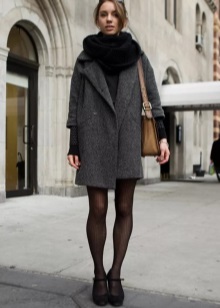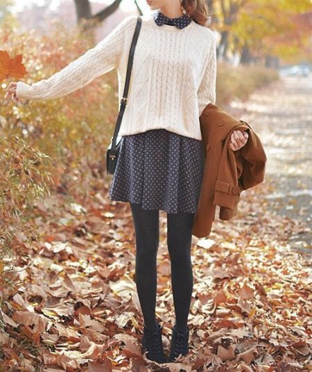 Typically youth image for the autumn weather. Closed shoes of dark color do not stand out much and look succinctly with a dress made of a shirt and a short sweater. A skirt of loose fit and dark tights will add femininity and elegance, as well as emphasize the slimness of the legs.Complete the image of a coat or coat in a contrasting color.