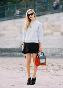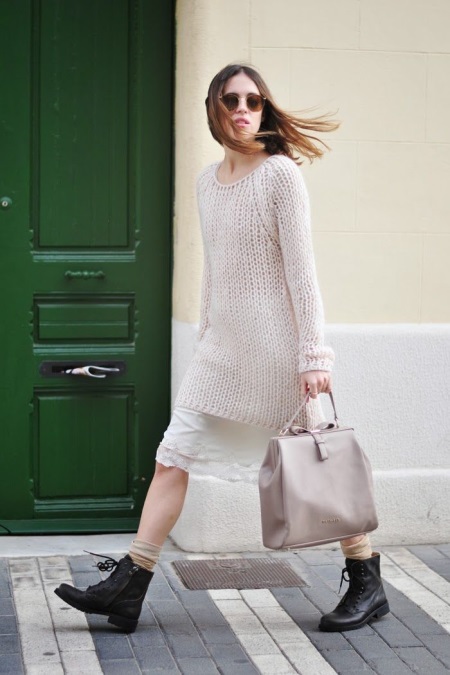 The image of a feminine dress and a sweater with a wide cut is no less stylish and attractive when there are massive shoes on the legs. This will give completeness to your bow.