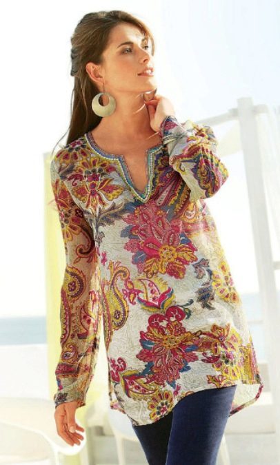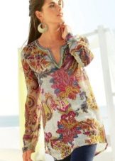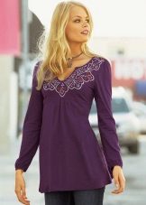 This season, straight solid color tunics are popular. They can be decorated with an asymmetrical bottom or small cuts on the sides. These models can be easily combined with vests, jackets, sweaters or jackets. Many models are decorated with embroidery or ethnic prints.