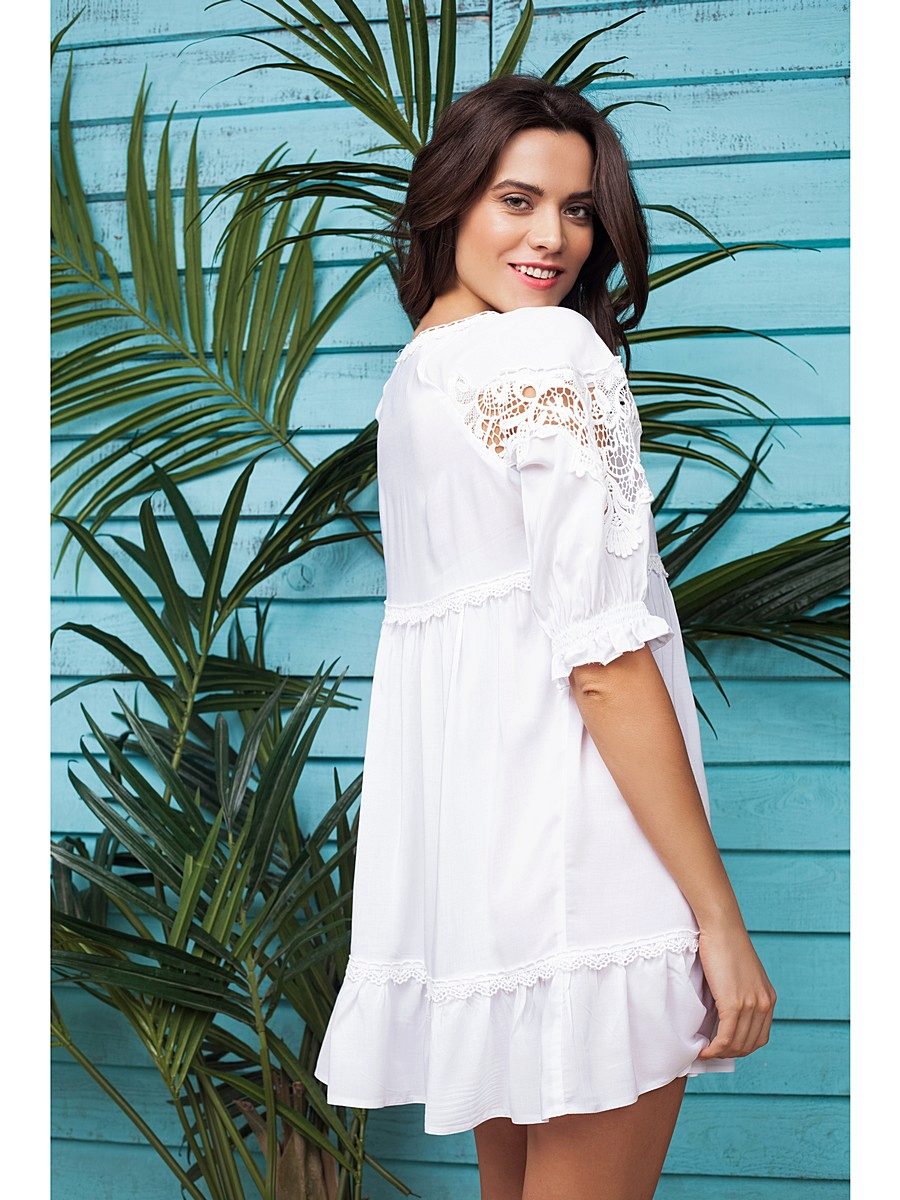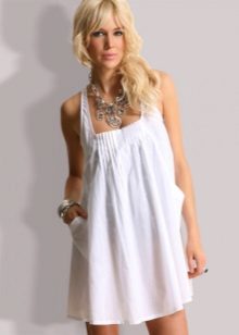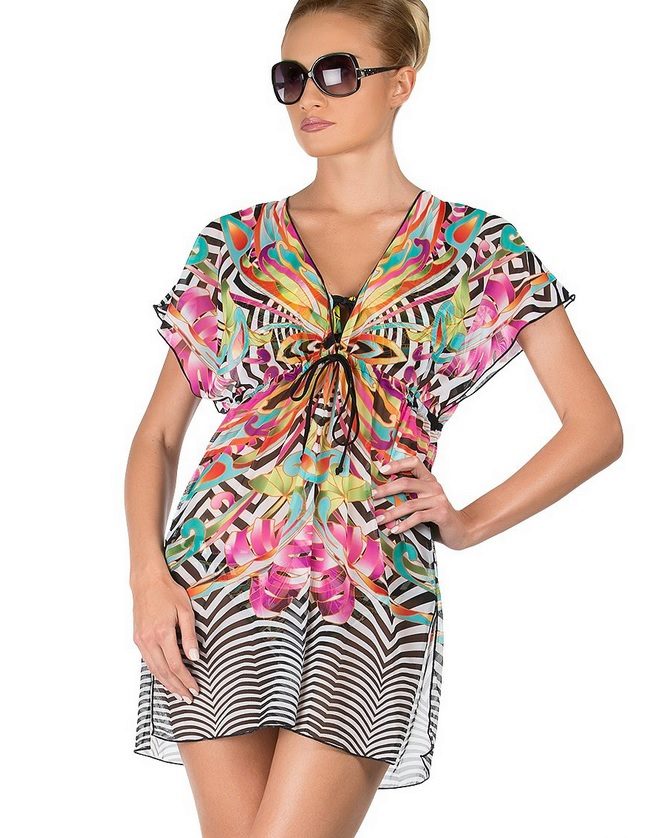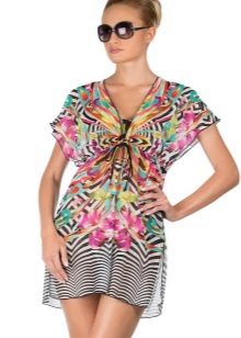 Girls for the rest of the sea should definitely buy a beach tunic. She looks like a short dress made of light fabric. This model perfectly protects the stomach from ultraviolet rays, and also opens arms and chest.