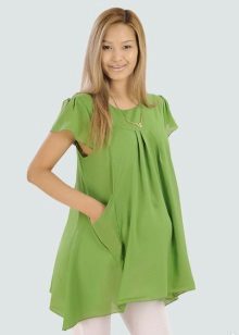 Today in the trend of asymmetrical tunic cut with a deep neckline. In this model, you will always look stylish and attractive. If a pregnant girl wants to hide her tummy from others, then a model with a high waist will be an excellent choice. Designers also offer styles with a drawstring, which runs under the belly, so you can, on the contrary, emphasize an interesting position.