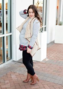 Every day the tunic can be combined with jeans for pregnant women who have an elastic band in the abdominal area. Jeans can be both narrowed and straight cut. An elegant scarf or a beautiful handbag will help to complement a stylish bow.