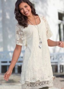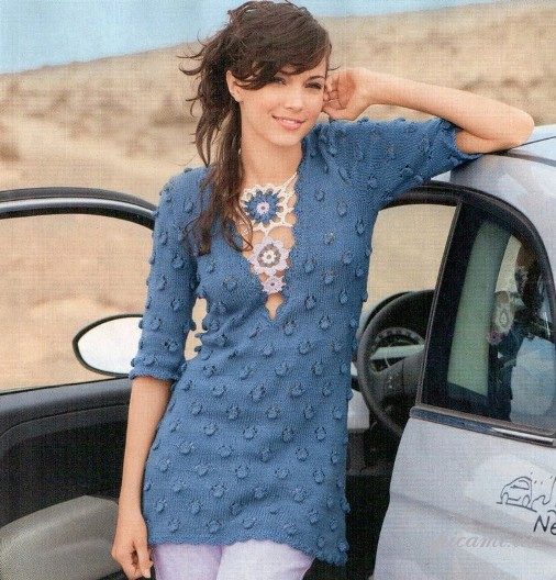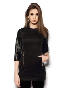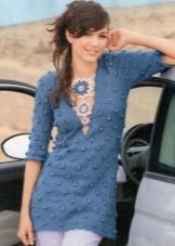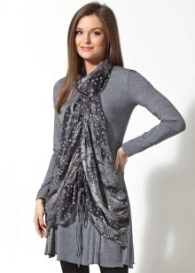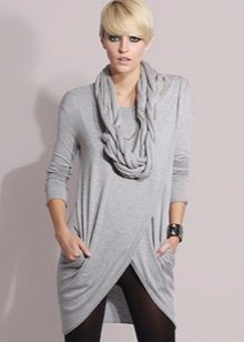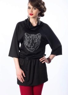 For the warm season, the tunic can be made of knitted fabric or knitwear fashionable this season. The model may have a short or long sleeve. Under the tunic with short sleeves, a turtleneck, blouse or shirt looks good. From above you can wear a strap or a wide belt.