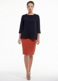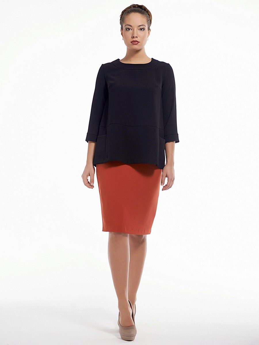 To create a strict, official style, a fitted tunic with a restrained color can be combined with a black straight skirt. The sleeve of the tunic can be long or ¾.