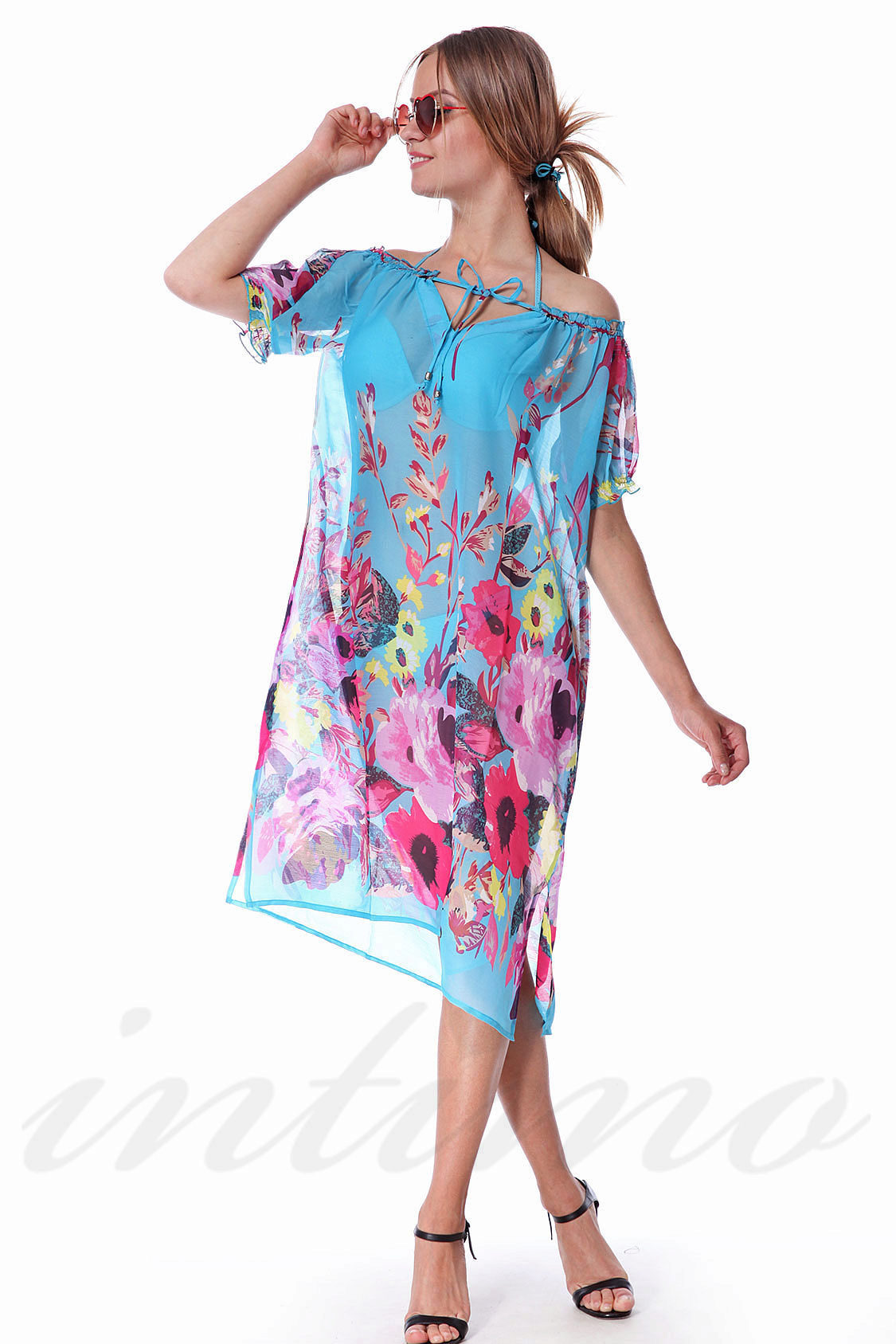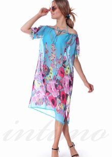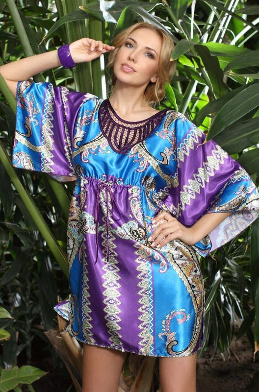 For light, airy beach tunics this season is characterized by bright, saturated tones of blue, turquoise, yellow, peach, green, pink, orange and blue. White tunics of different lengths are still relevant.