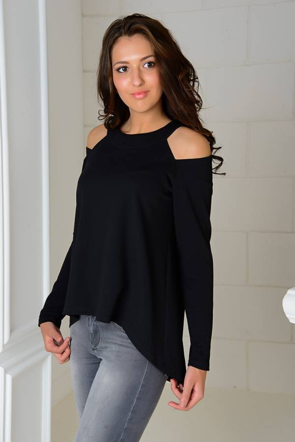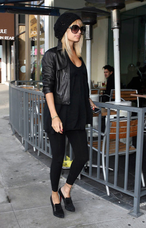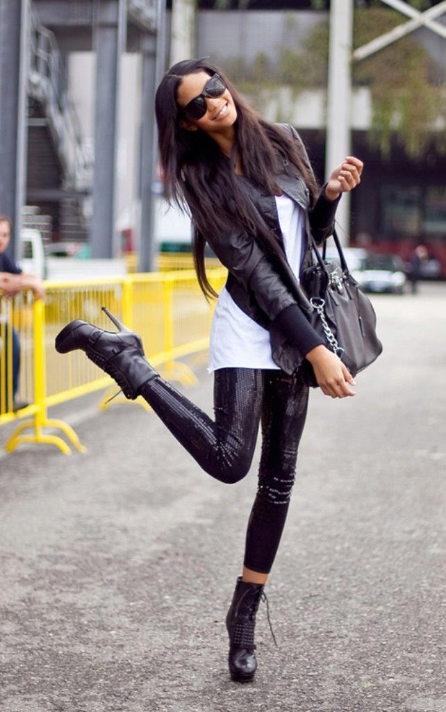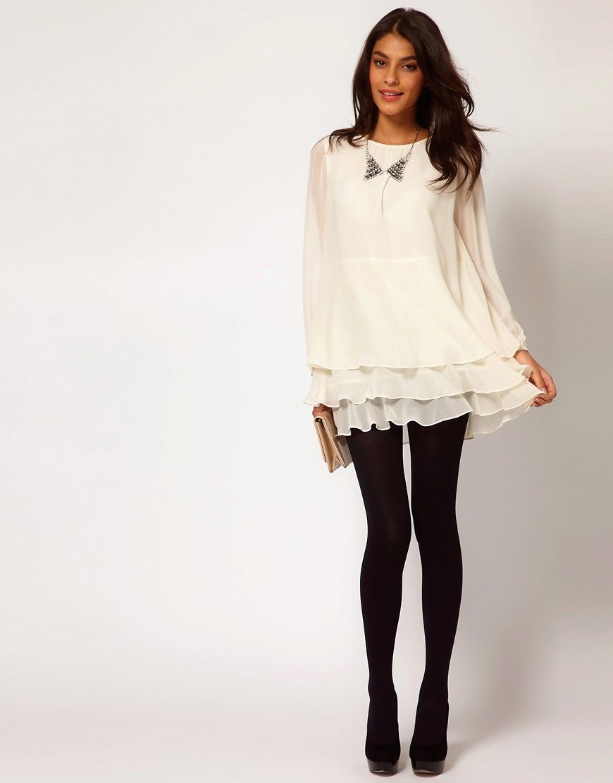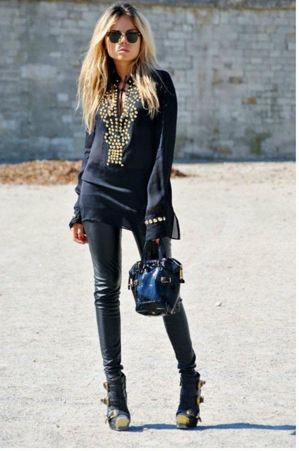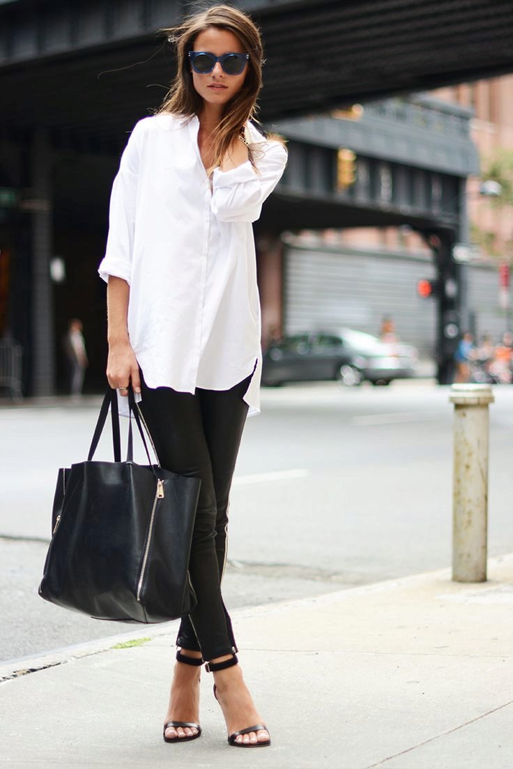 Simple black leggings or tight pants and classic high heel shoes are perfect for a fitted asymmetrical tunic.