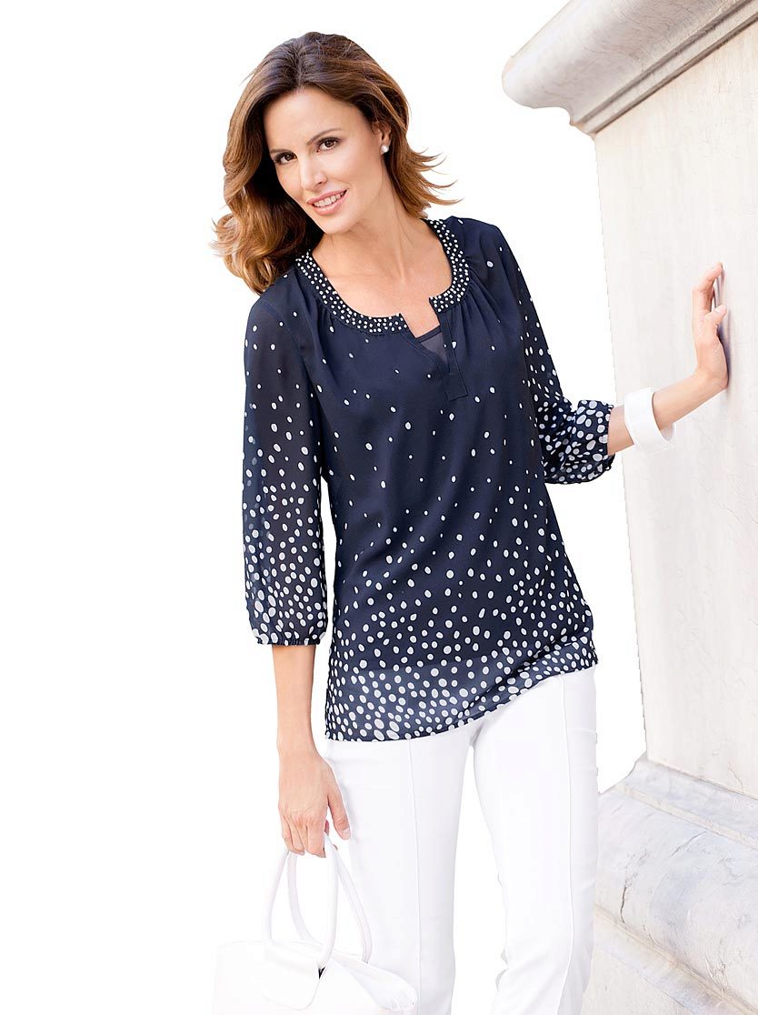Among the most popular prints in the first place are floral designs - flowers and petals adorning the upper part of the tunic, the neck or the lower part of the model.