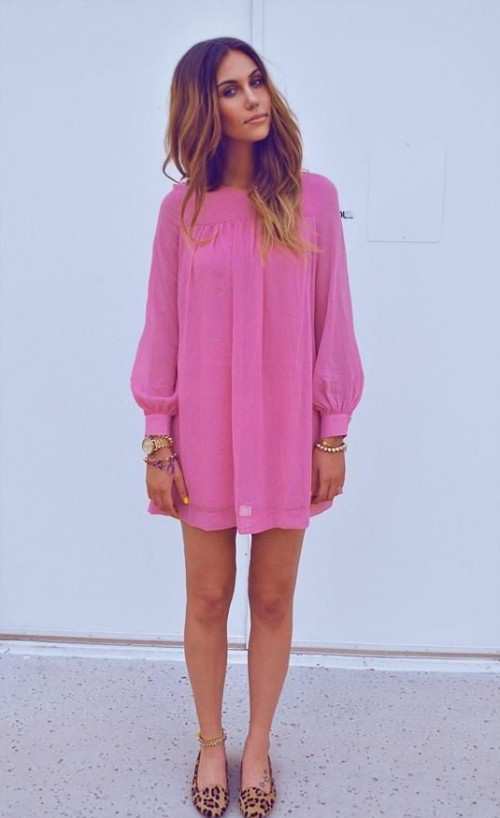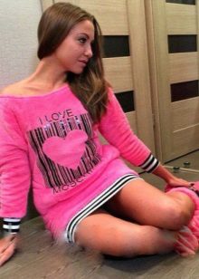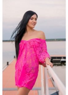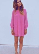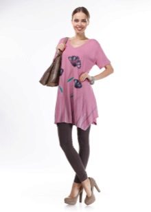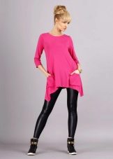 - An elongated tunic of deep, deep pink color can be worn like a mini-dress.In this case, it is necessary to pick up shoes of classic colors, for example, black, white, beige or the same shade as the tunic itself, and so that it would not be too defiant you can combine with black lossins.