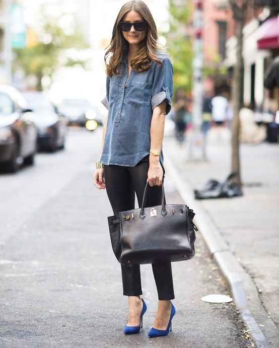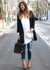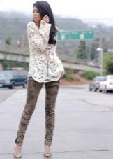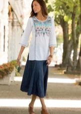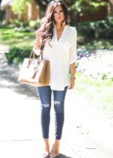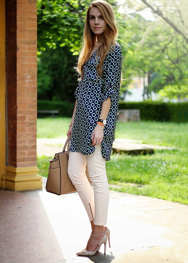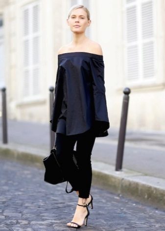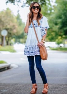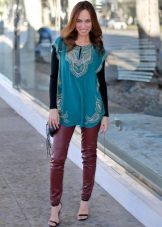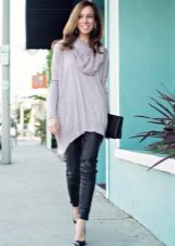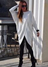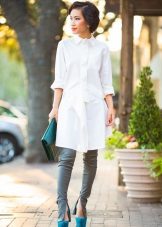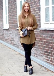 The most common are tunic shirts or tunic blouses. They will be equally well combined fitting clothes (jeans, leggings, breeches, shorts), and more spacious (pants, pants, harem pants, flared skirt). You can easily achieve a business look by choosing a pencil skirt or dress pants as a companion.