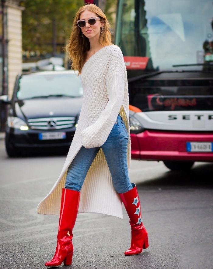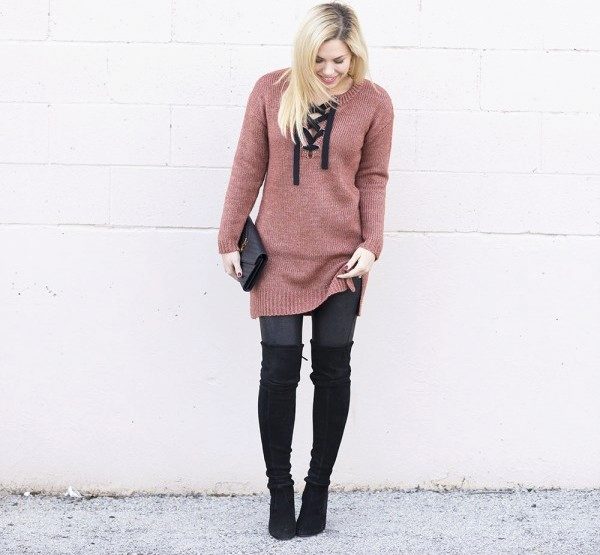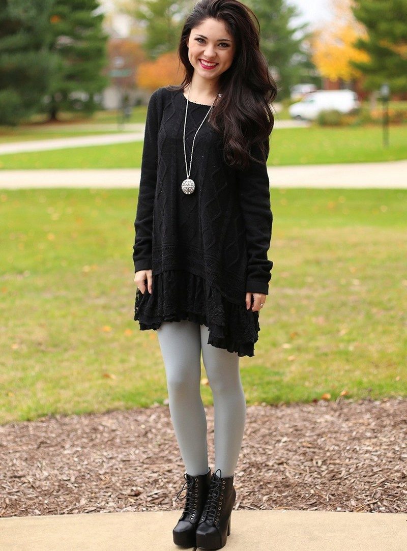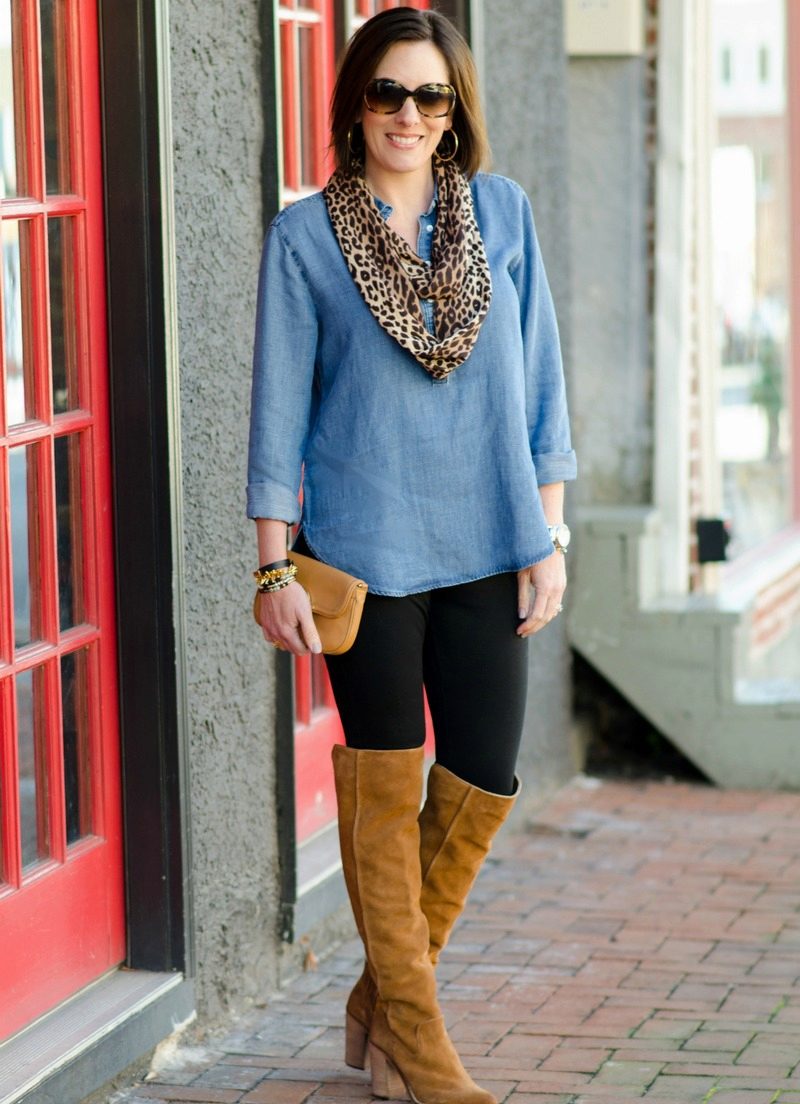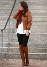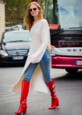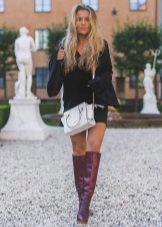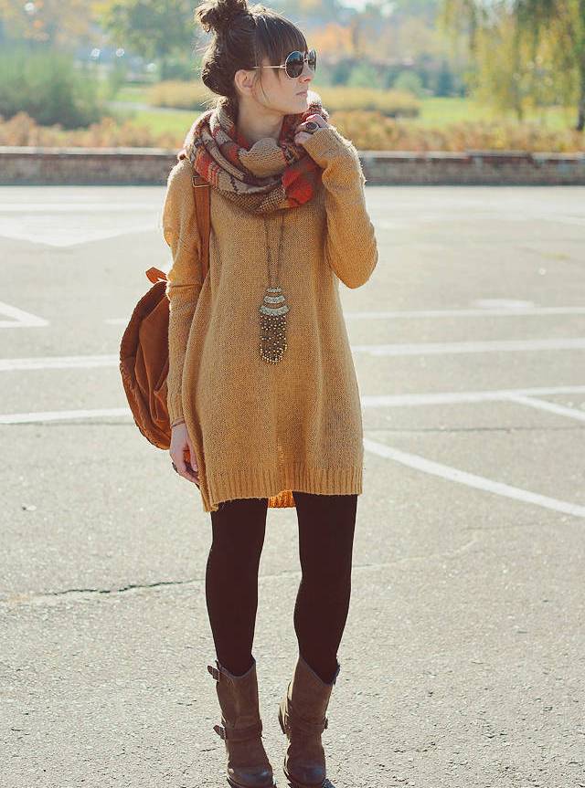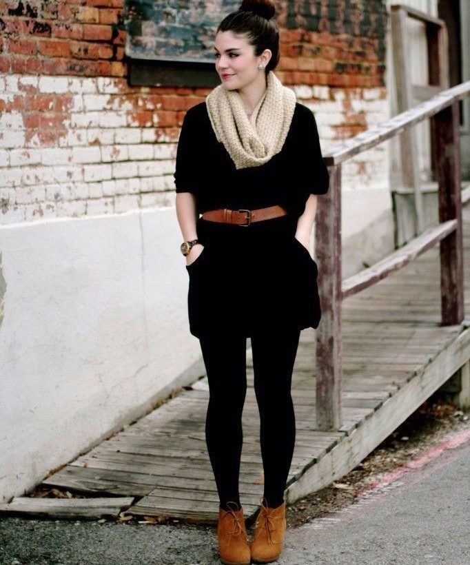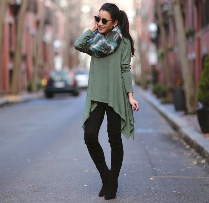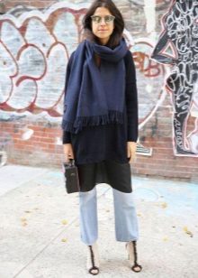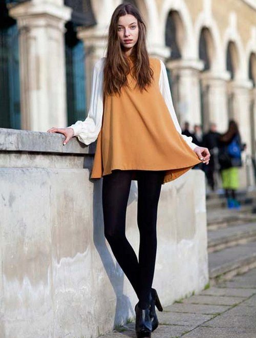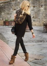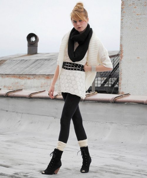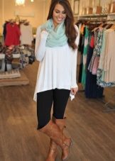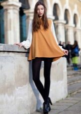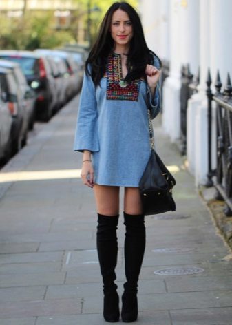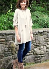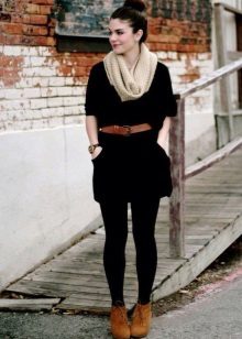 However, if the weather requires it, nylon or insulated beautiful tights, as well as high knee-highs will suit the tunic. Do not forget about leggings and, in extreme cases, tight jeans. From shoes fit sandals and sandals on a flat sole or platform, shoes with heels, and for the most daring high boots and jackboots.