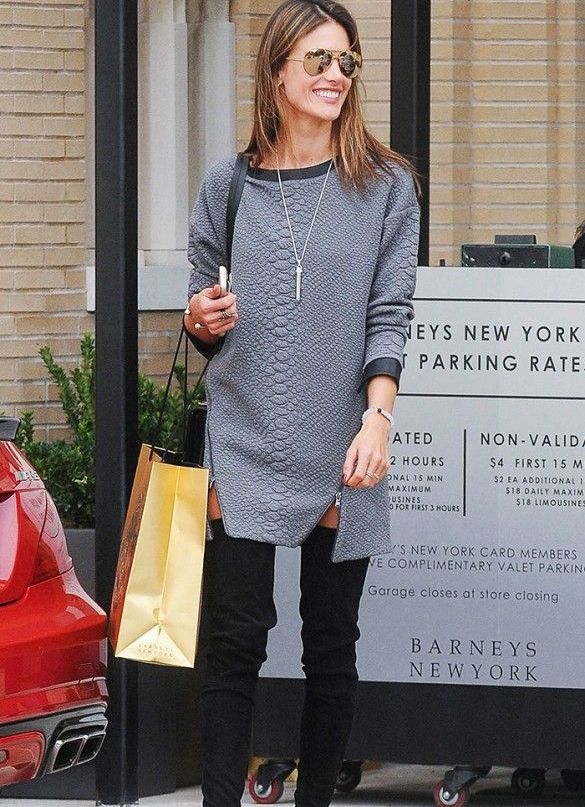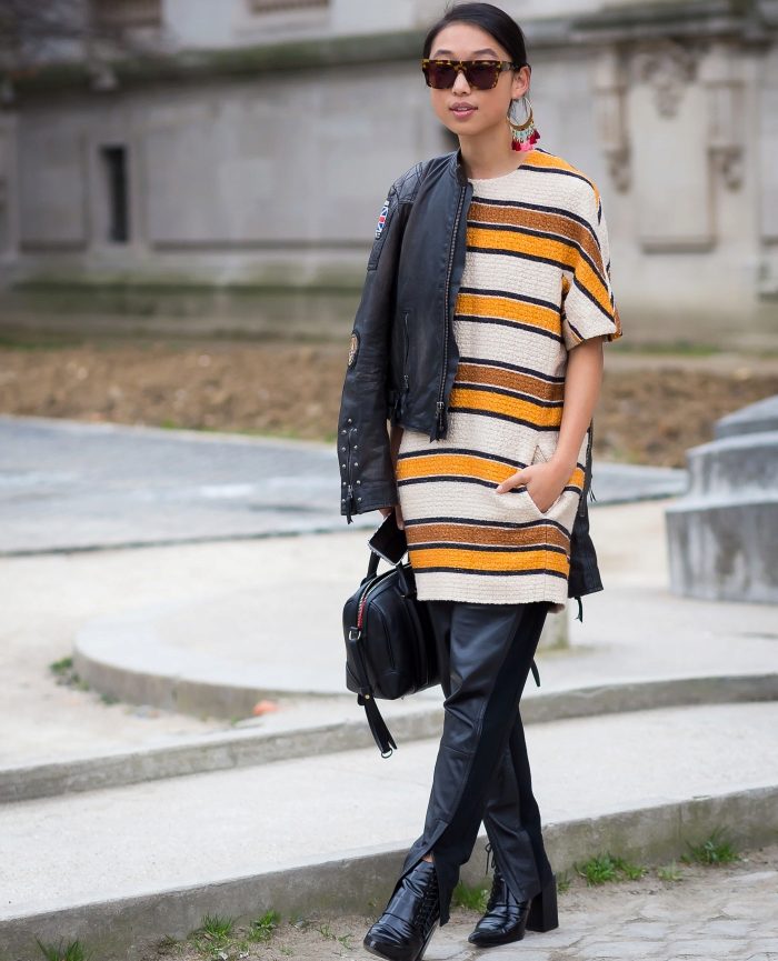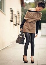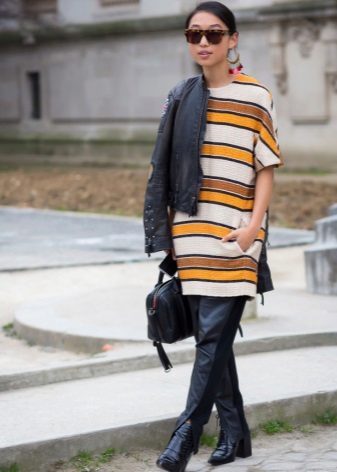 The main combination of the year is a spacious tunic and plain light or dark leggings, skinny jeans, and shorts. As for leggings, knitwear is the least relevant this year, so we recommend paying attention to leather or dzhegginsy.