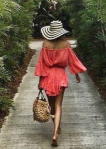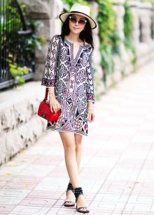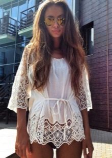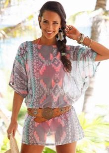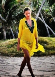 Tunic is used in combination with pareo on the hips, shorts, skirts. An elongated model can be worn without combination with other things. Shoes should be comfortable for walking on sand or pebbles, so it is best to choose sandals, shale or sandals on a flat sole. On hot sunny days you should not forget about hats or panamas, sunglasses.