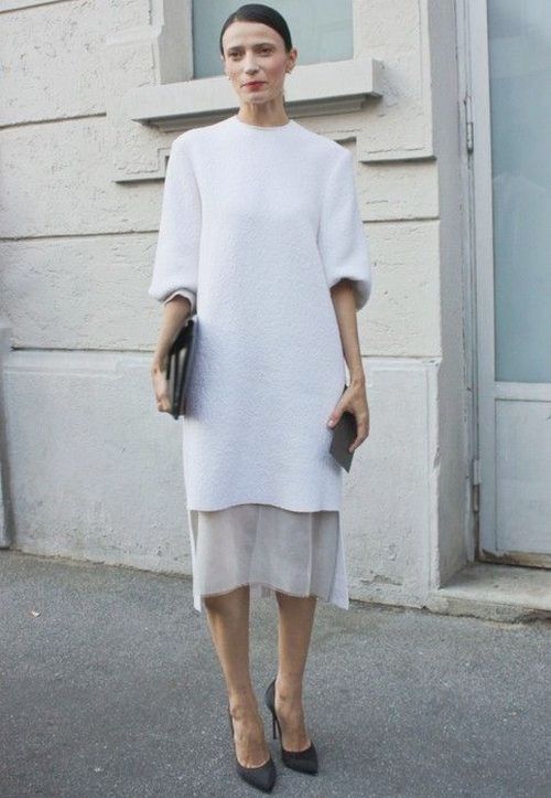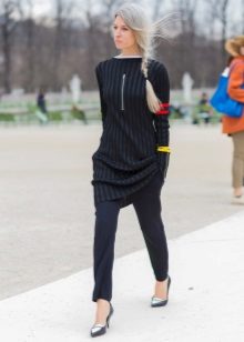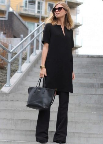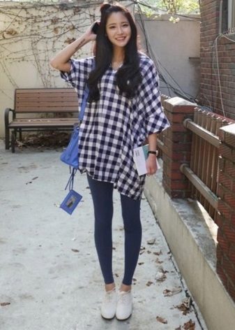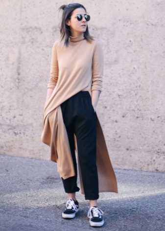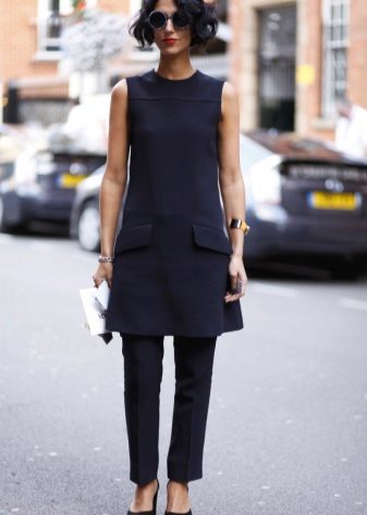 Tunic dress or short tunic with leggings, skirts, shorts, jeans. The style's credo is simplicity, rigor. Casual casual - tunic with blouse and turtleneck, pencil skirt, leather shorts or pants. Sports - cropped tunic with shorts, pants, sneakers or sneakers.