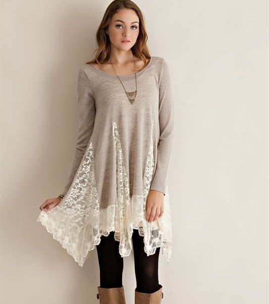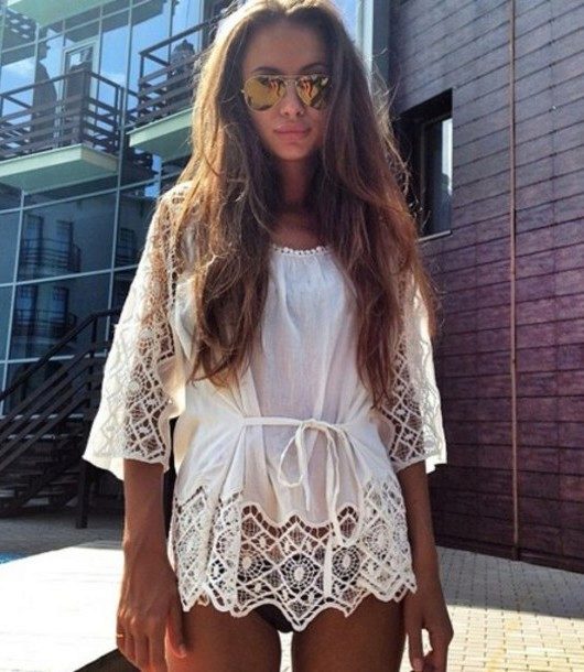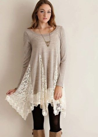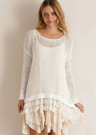 Openwork tunics or with lace inserts, ruffles will create a gentle image.The white top will be indispensable under the translucent thing. Tunic dress can be limited to a combination with tights, but the shortened one can be combined with cute skirts.