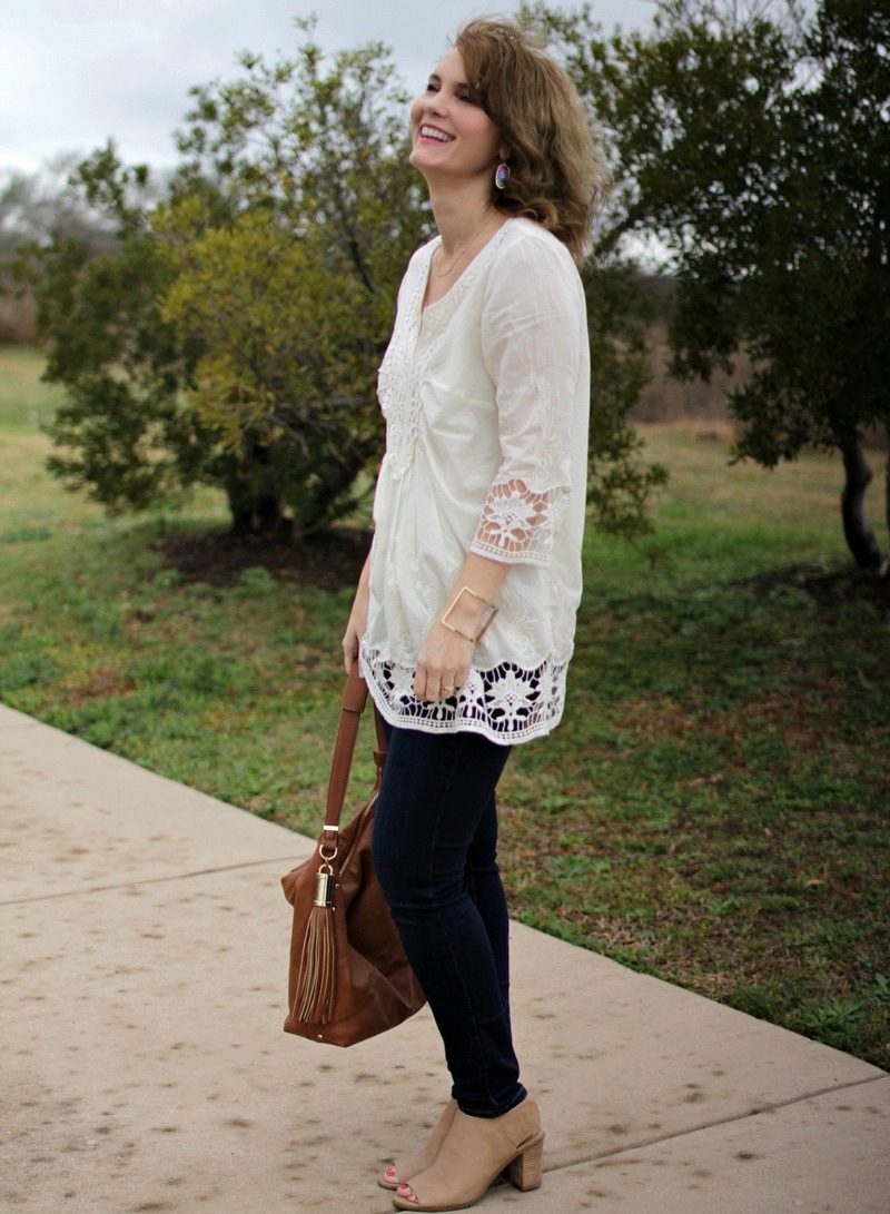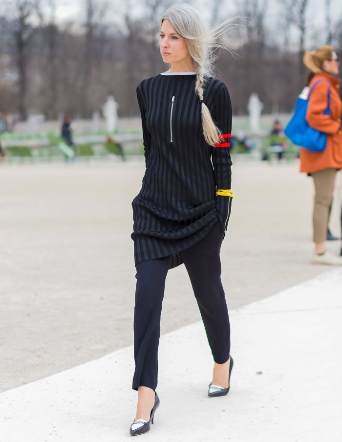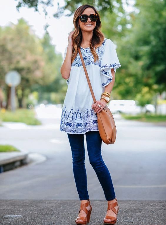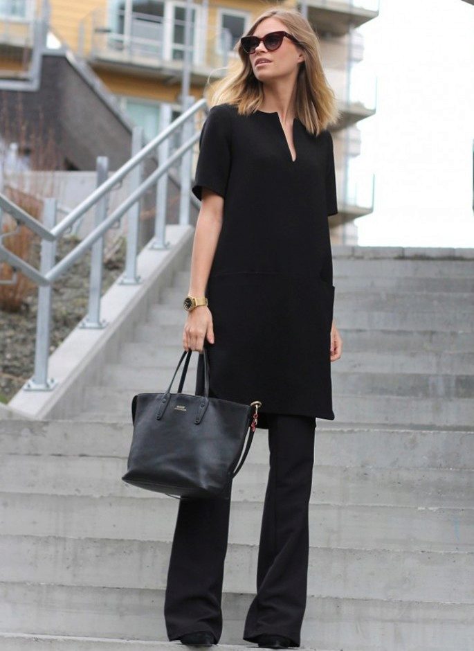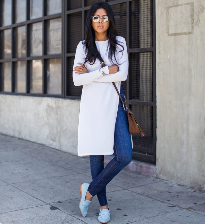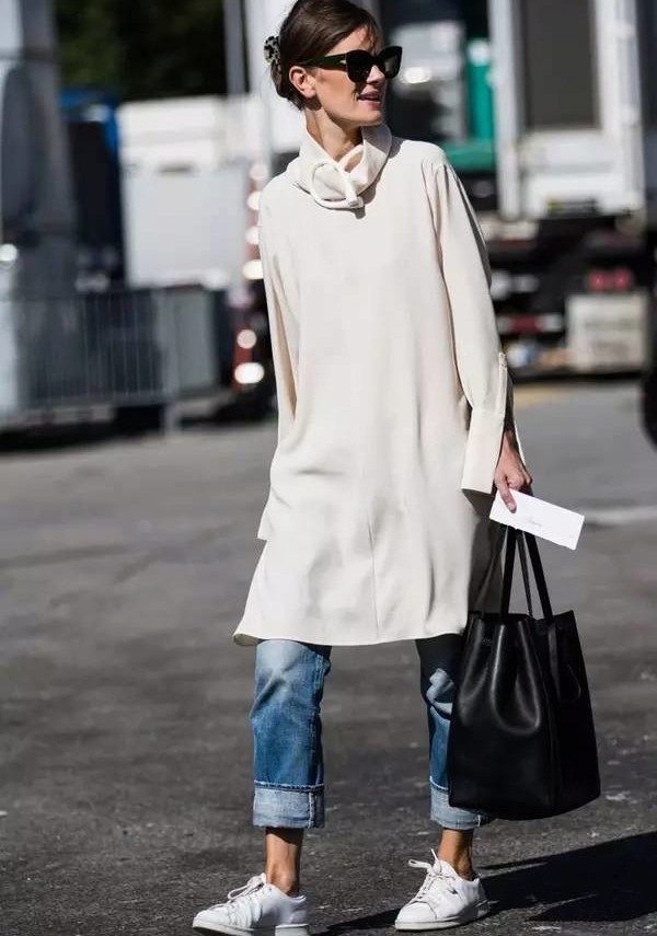 For a white tunic, blue jeans with fatigue, colorful shorts and skirts, colored leggings, black or dark pants (tapered, loose) are best. Bright shoes and sandals or coarse boots and ankle boots will complete the look. Universal black will look great with pants and jeans in red, blue, white pants, colorful skirts.