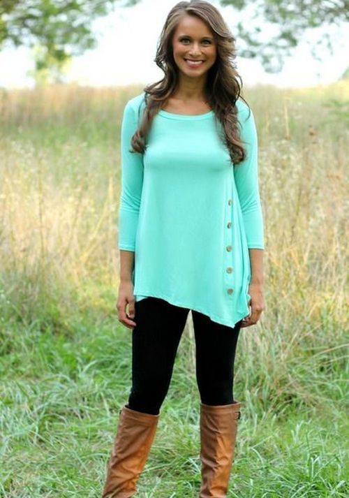 Long tunics are not suitable for low girls, but short ones will be able to open the view of the legs and visually lengthen them.