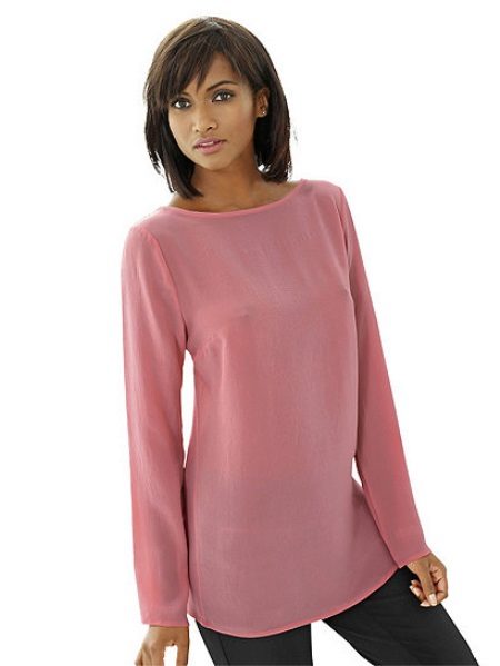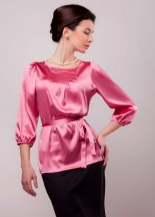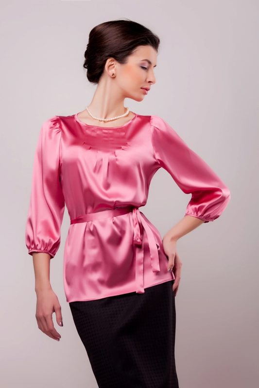 Rather strict model suitable for work. A long sleeve, semi-fit silhouette, a round shallow neckline is diluted with a cheerful, and at the same time a delicate pink color.