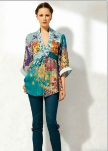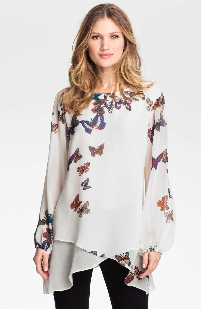Beautiful spring and summer tunic with a print in the form of bright butterflies. She looks great with a skirt and pants in the office, and with jeans for a walk.