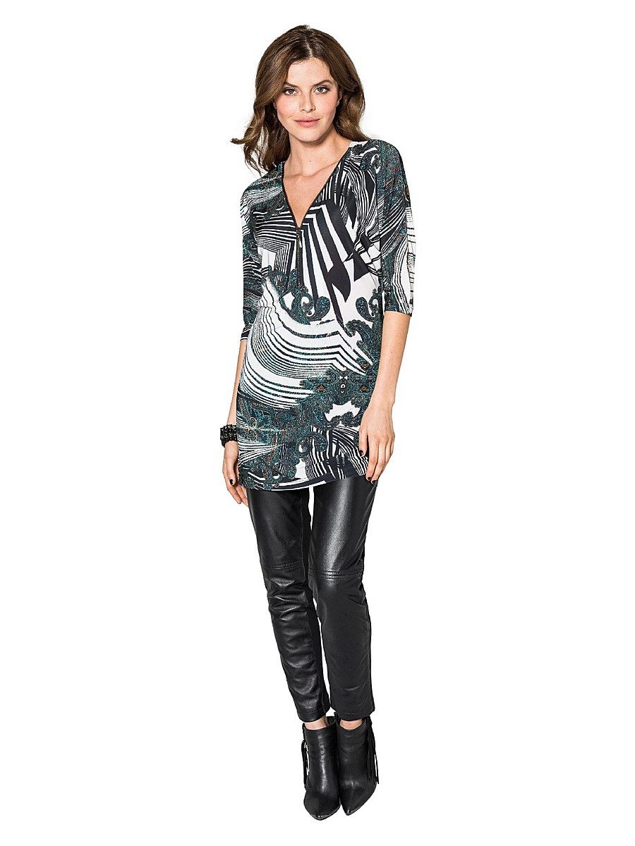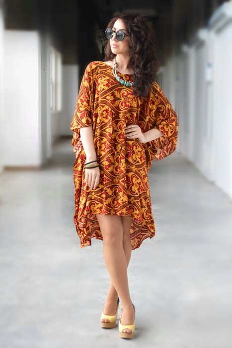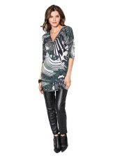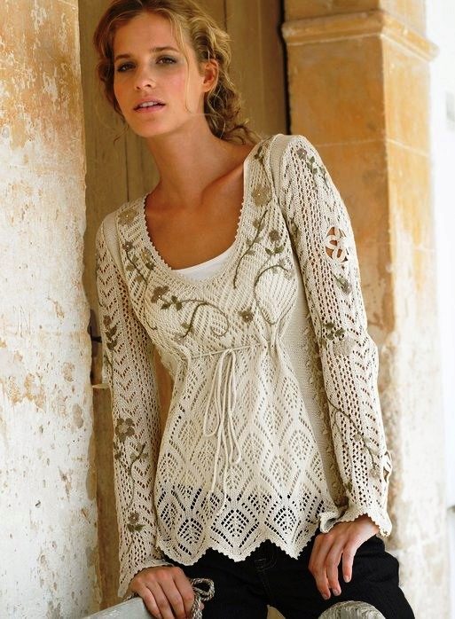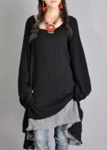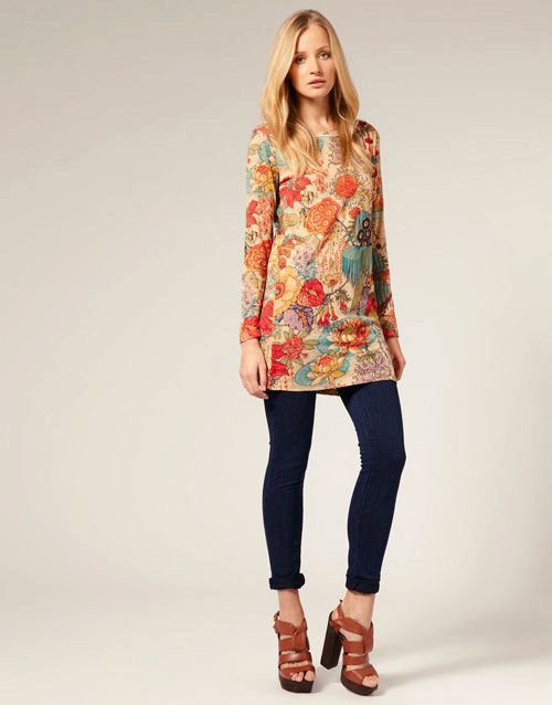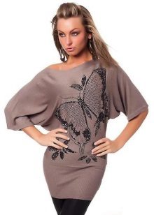 Suitable motifs for products of this kind are ethno, floral, and even gypsy.The only rule that should be strictly followed is that the knitted tunic, decorated with a print, immediately becomes the main accent of the image, and the rest of the details must comply with it.
