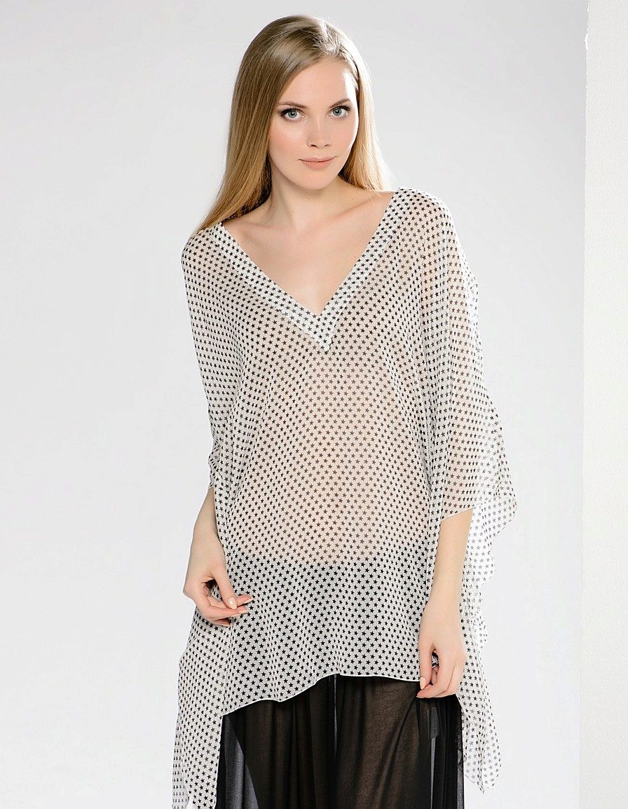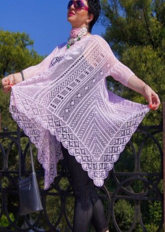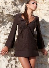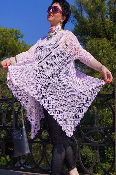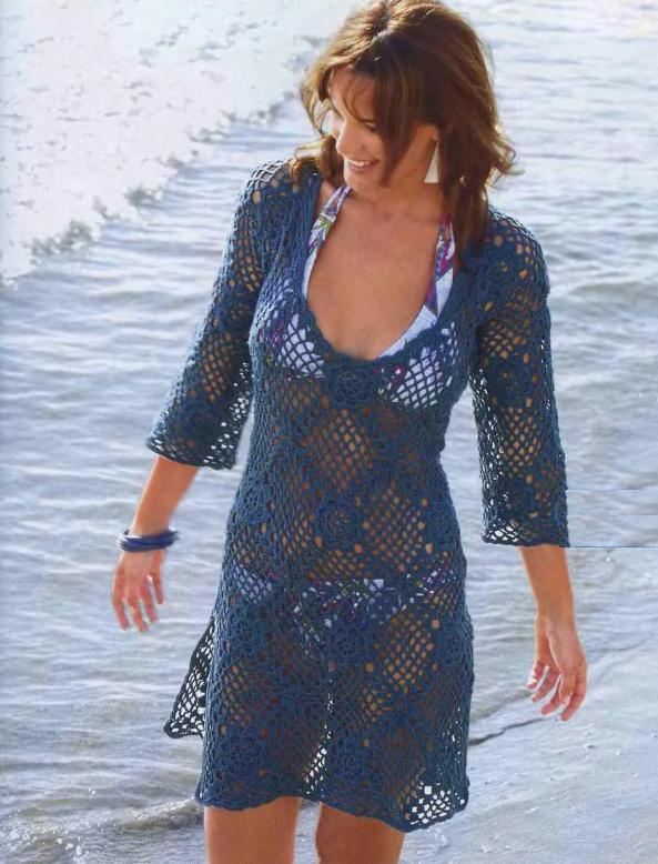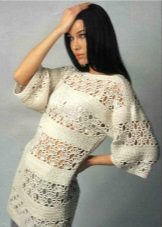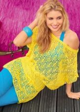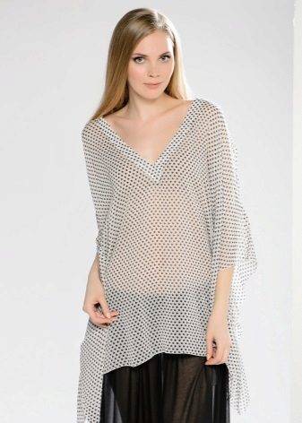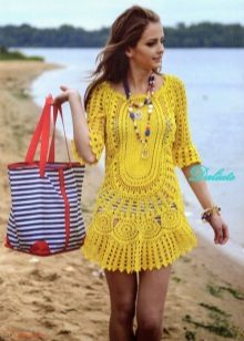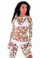 A thin openwork tunic will be indispensable for relaxing on the beach. Light and airy, she expressively emphasizes the elegant figure, dressed in a bikini. Semitransparent tunics with large cells are often decorated with knitted floral, plant or geometric patterns (one of the most recognizable ones is “pineapple”), or simply represent a mesh of different meshes. If in such a dress you need to go "to the people", then it is worthwhile to pry under it a long tight fitting T-shirt or T-shirt.