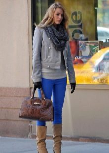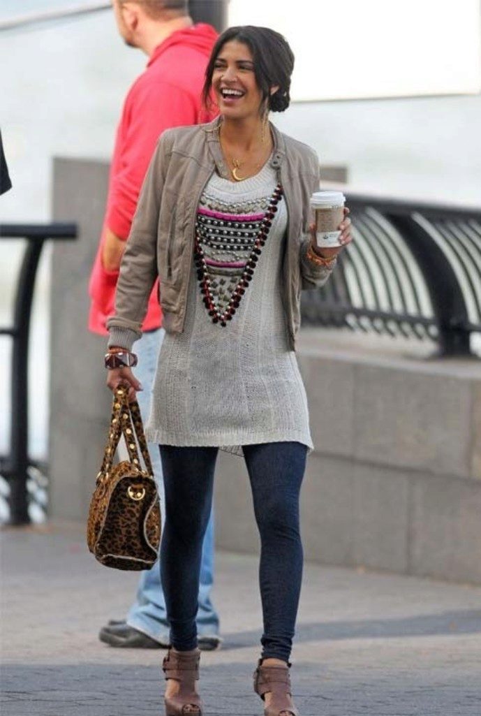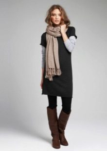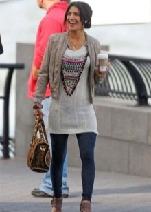 On cooler days, we advise you to put a fitted jacket, a shortened raincoat or a voluminous cardigan on top of a knitted tunic. A stylish solution - knitted tunic and fur vest. An attractive casual set will come out of a knit tunic and leather jacket. Having included jeans-skinny ensemble, a volume bag with rivets and having put on favorite shoe boots, it is possible to go fearlessly for walk or shopping. A jacket park or a warm puff will help create a sporting bow, and a cozy scarf wrapped around your neck will create a unique romantic mood.