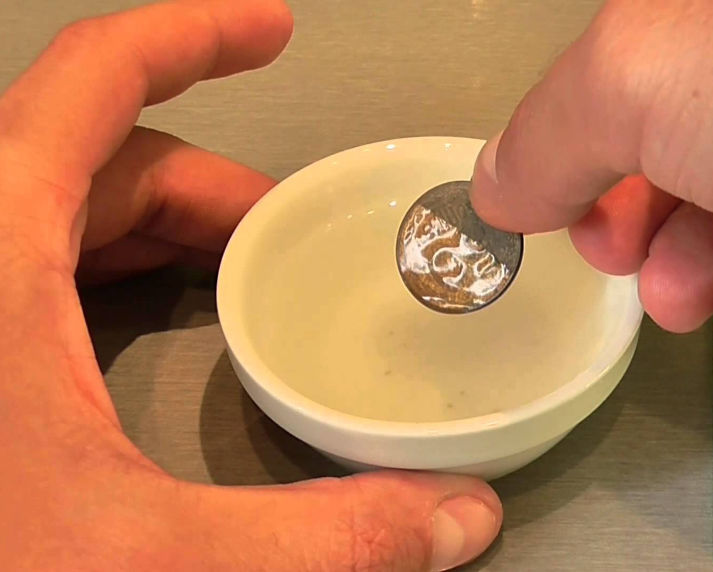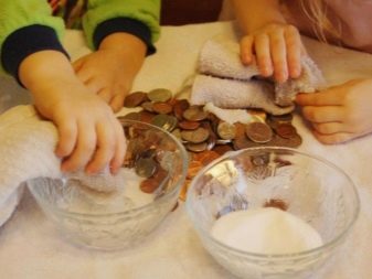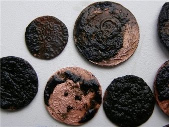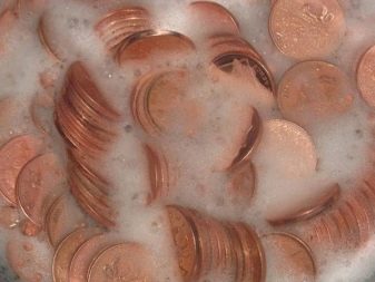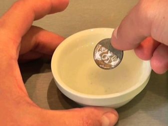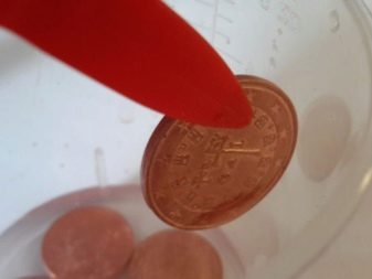Often on the coins there are greenish raids. In a glass of water, 1/10 poured citric acid, and then top up with clean water. Then they carefully put the coins into the glass and watch the reaction. As soon as all the liquid acquires a green tint, the products are removed, thoroughly washed and slightly polished.