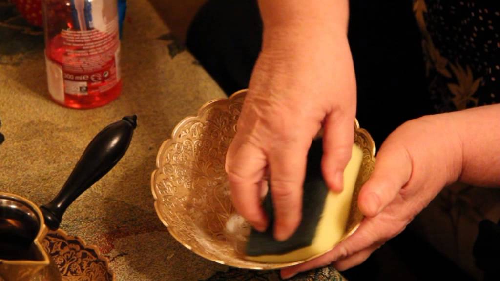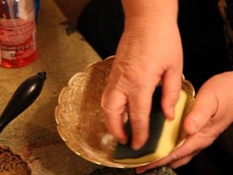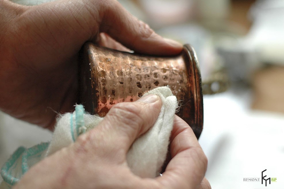 Antique or heavily soiled things should be put in a solution of salt and vinegar, bring to a boil and immediately remove from heat. When the liquid has cooled, the products are washed with warm clear water and dried. Very dirty surfaces are rubbed with a cloth impregnated with a low concentration of hydrochloric acid.
