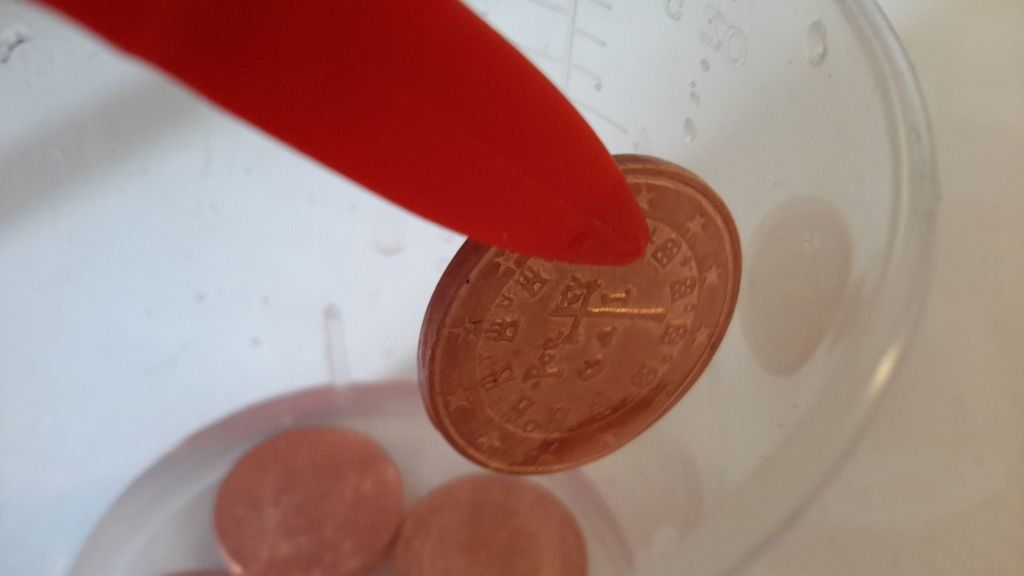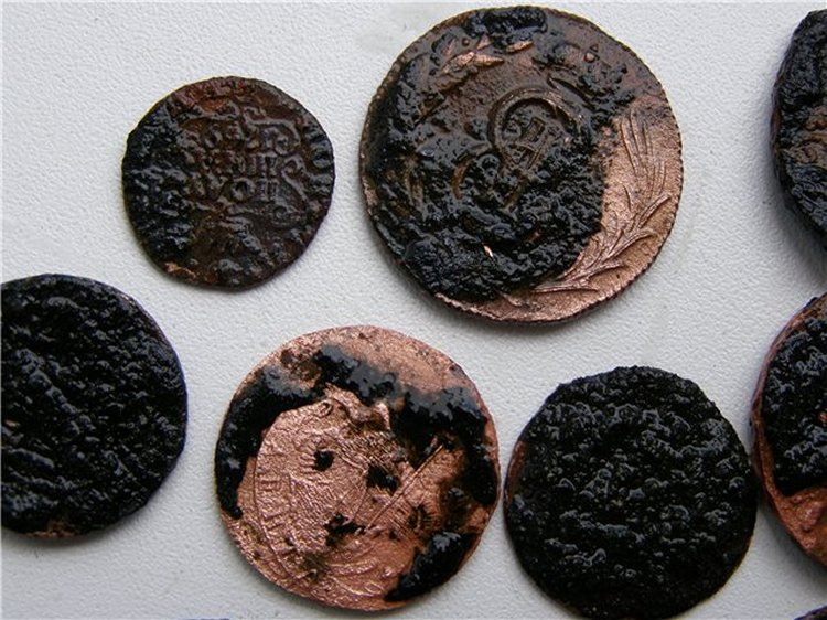 A ten percent solution of vinegar in water can quickly remove yellow patina. When the dirt is gone, the mixture should be carefully drained, and the coins rinsed in warm water. While they are not washed, it is not recommended to take them with unprotected hands! The red layer is removed with ammonia 5% - sometimes it is necessary to keep the copper circles in it for several hours, otherwise the initial view cannot be returned. As always, after cleaning with any composition, rinsing in water is obligatory.