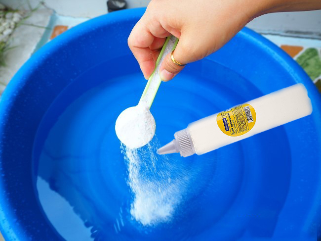 - Fill a large container with water (about ten liters), add grated soap (about two thirds of a piece), add about 150 milliliters of glue to the process of mixing and dissolving the soap;