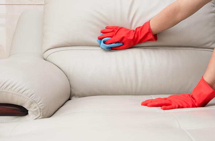 - Special care should be taken when cleaning leather furniture of light shades. It requires delicate handling. The best way to clean the stains is to cope with milk and chicken protein. The ingredients are mixed to form a foam, then the mixture is applied to a rag and rubbed over with a soiled surface.