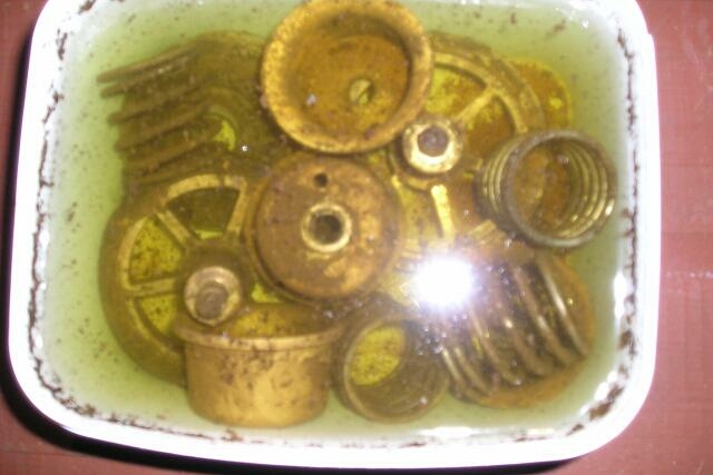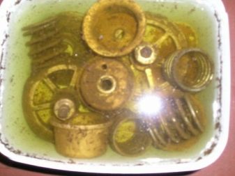 - Soap solution. Brass items should be soaked in soapy water. If the contamination is not very strong, soaking will be enough to clear the surface. Put shavings from laundry soap in warm water, dissolve it. Put the product in soapy water, leave it there for a while until the liquid has cooled. Then drain it and rub the object under running water using a soft bristled brush.