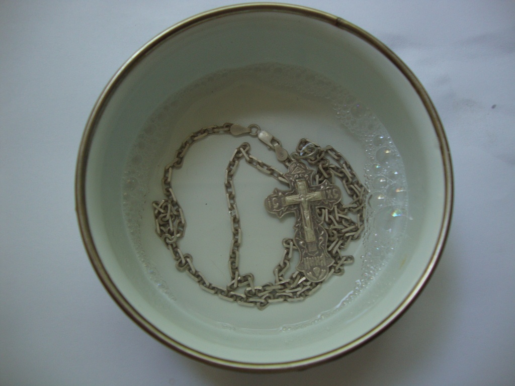 This tool is very effective and able to cope with even the most inaccessible places. For it will need only one tablespoon of alcohol and a liter of soapy water. The cross is placed in this liquid, remaining there for several hours, after which it is wiped with a damp cloth.