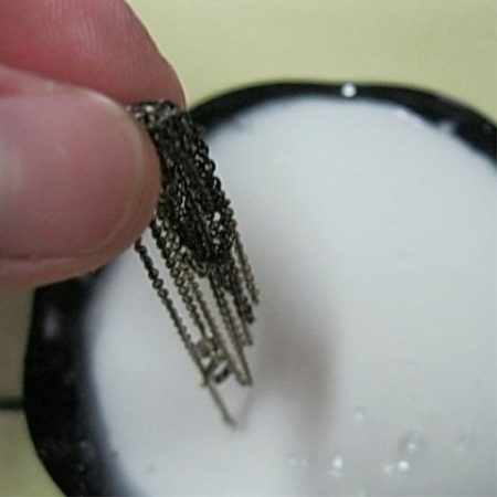 This method will take a little more time than the others and cannot be classified as particularly harmless, because the acid and high temperature water required here are very serious things and you will have to show all possible vigilance. Acid with water (1: 5 ratio) in a metal dish should be brought to a boil and put jewelry in a liquid, and then cook for another 15 minutes. Next, it will remain to remove the silver, rinse it with warm water (most importantly, not cold, so as not to make a strong temperature drop) and dry it.