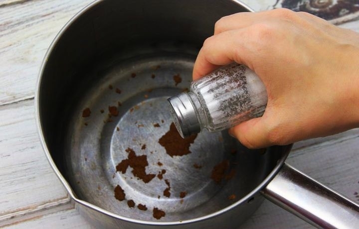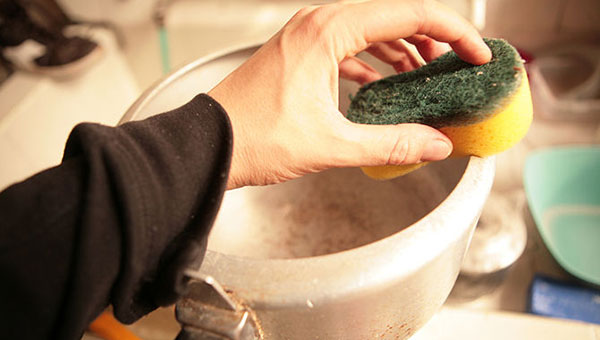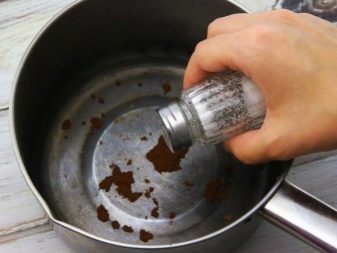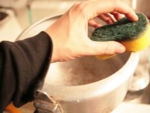 A soft sponge moistened in brine or kefir can easily remove stewpots and pans from dark spots on the surface. Rubbing the surface with a sponge, leave the dishes for 1.5-2 hours. After that, the pan should be thoroughly rinsed with warm water.