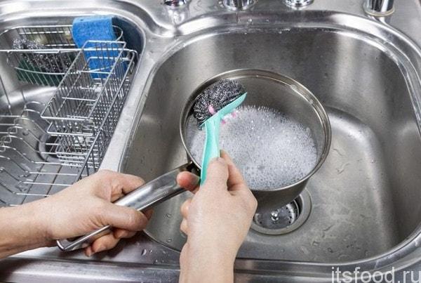 Soaking dishes in a soapy solution helps to get rid of burned food particles and stubborn fat. However, this process should not be delayed, the soaking time should be 7-10 minutes.
