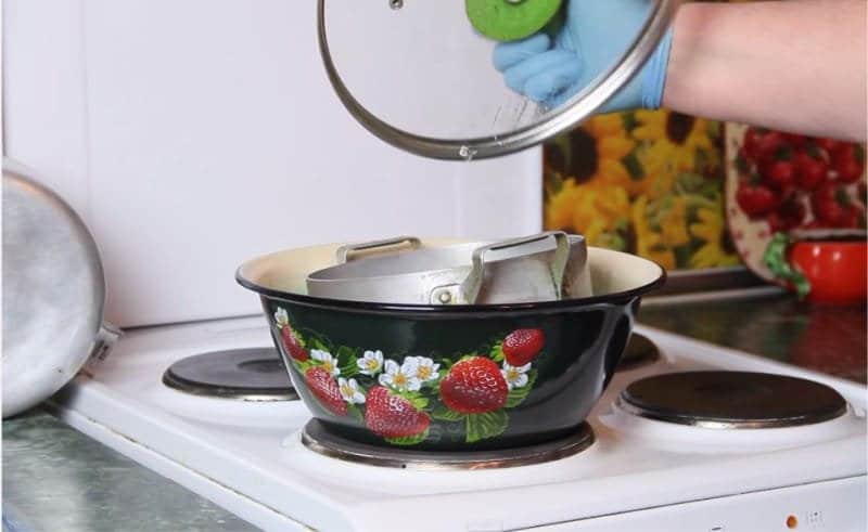 To clean the aluminum utensils of black plaque and other difficult contamination, you need to boil it in a solution of soda and silicate glue. To do this, you need to pick up a large container, in which, when filled with water, you can completely dip the cleaned kitchen item. For 1 liter of water, add 1 tablespoon of baking soda and a few drops of stationery or silicate glue. You can only use soda.