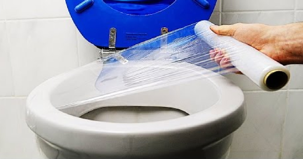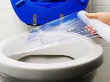 - There is another effective method that can clear the blockage in the toilet. For this method is used double sided tape and plastic film. It is important that the film is in perfect condition without defects, and the size was slightly larger than the toilet lid. Follow these steps: